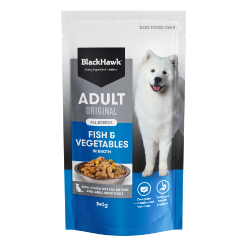 As a pet parent, it’s natural to want to offer your dog a range of textures and flavours. Black Hawk Fish and Vegetables in broth has been specifically designed to help you keep mealtimes interesting, without compromising your adult dog’s balanced nutrition. It is served in a rich and delicious chicken broth and includes nutritious vegetables and fish, packed with omega-3 fatty acids and protein to support your dog’s body and brain.