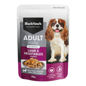 As a pet parent, it’s natural to want to offer your dog a range of textures and flavours. Add variety to your dog’s mealtimes with Black Hawk Original Adult Lamb and Vegetables wet food. This wet food range has been specifically designed to help you keep mealtimes interesting, without compromising your dog’s balanced nutrition. It is served in a rich and delicious chicken broth and includes nutritious vegetables and lamb, a highly digestible protein rich in iron and vitamin B12, which may assist your dog’s heart health.