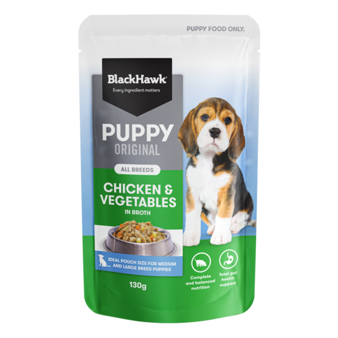 Black Hawk Puppy Chicken & Vegetables in Broth is formulated to meet the nutritional levels established by the Association of American Feed Control Officials (AAFCO) Dog Food Nutrient Profiles for growth including growth of large size dogs (30kg or more as an adult).