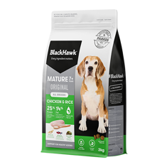 The Black Hawk Original Mature range has been designed to suit adult dogs. However, please be mindful that this range has reduced calories which means your adult dog may need to eat more to meet their energy needs. Also, if your dog has any specific concerns, preferences or individual needs, you may want to consider the Black Hawk Healthy Benefits range, or another such as our grain free options, or our wet food offering in cans or trays.