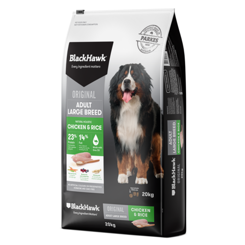 Black Hawk Large Breed Chicken and Rice contains a delicious, lean and highly digestible chicken-based protein source, packed with amino acids which are essential for building strong bones and muscles.